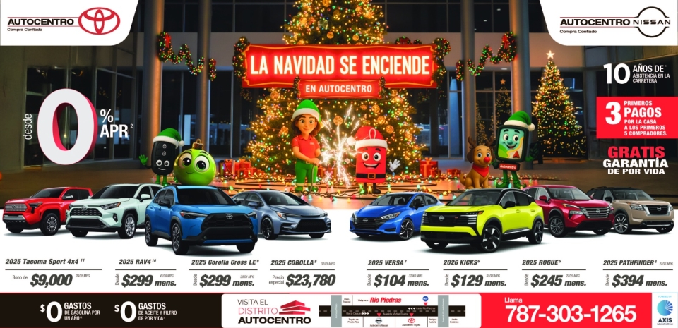 Todos los financiamientos y ofertas están sujetos a aprobación de crédito en adición a parámetros establecidos por la entidad de financiamiento. Ninguna oferta puede ser combinada con otras, ciertas restricciones aplican. Algunos modelos podrían no ser igual al ilustrado. Toda oferta mostrada y mencionada aquí son sujetas a aprobación de crédito. Unidades anunciadas son sujeto a disponibilidad de inventario. Ofertas válidas hasta el 15 de diciembre de 2025 o mientras duren las unidades.